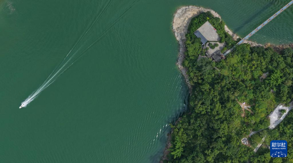 7月7日,在恩施州建始县景阳镇,游客坐快艇观光(无人机照片)。
