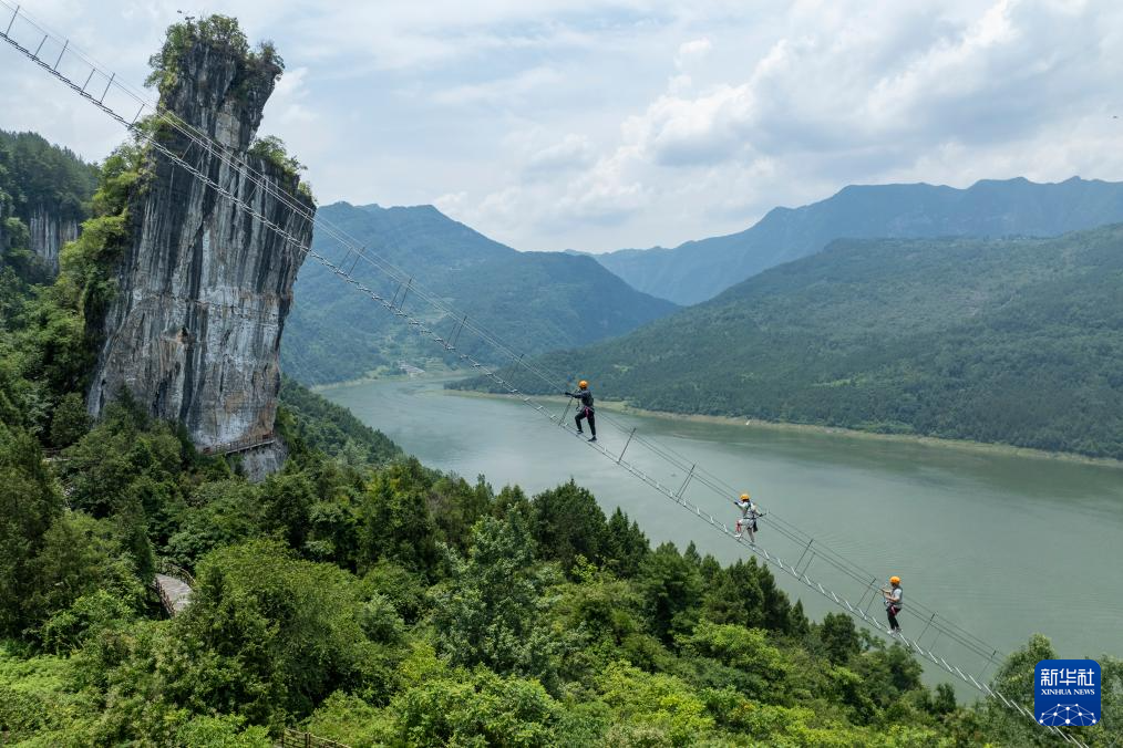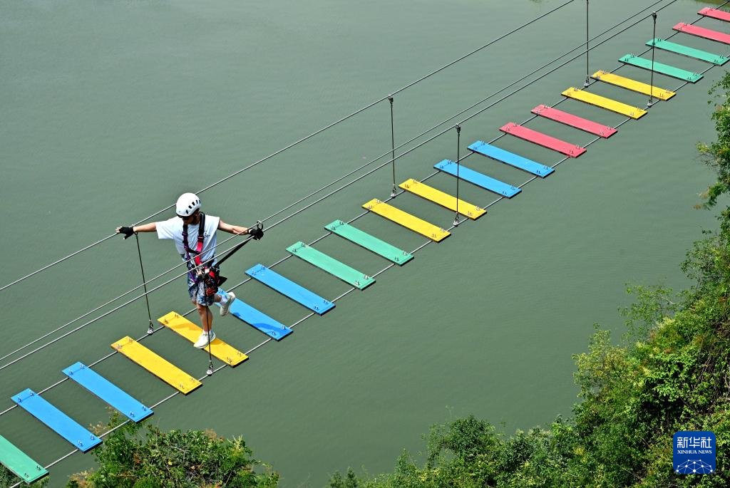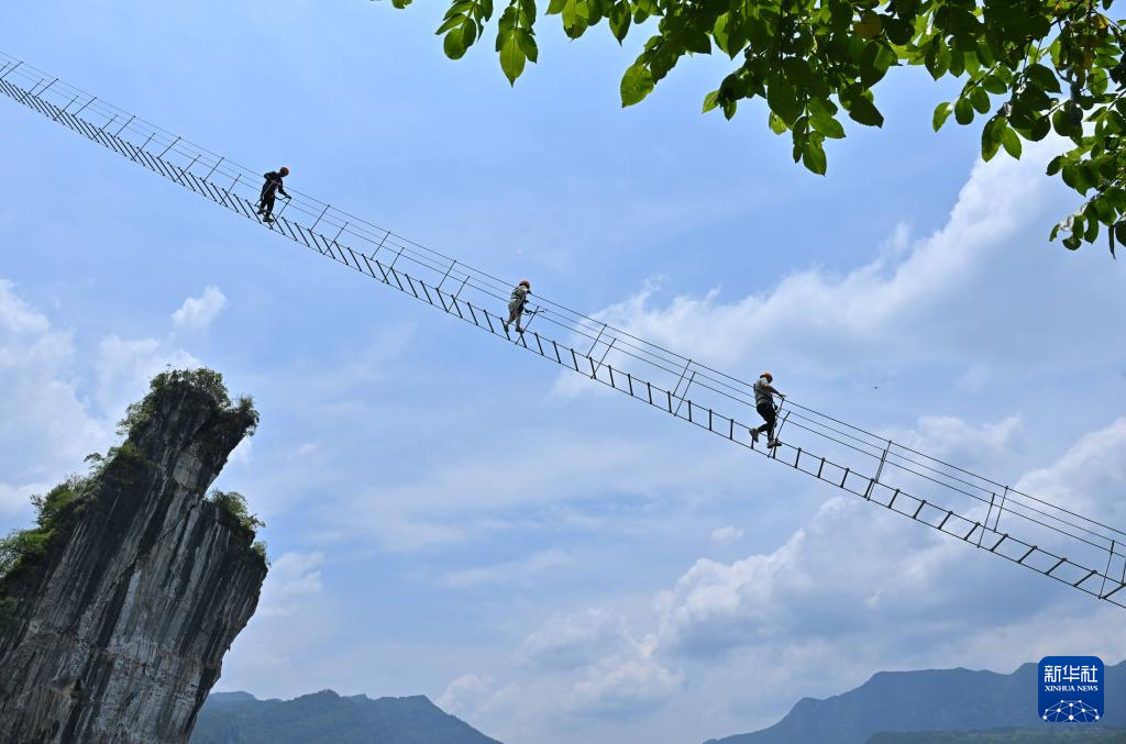 7月8日,在湖北省恩施市新塘乡红花峰林景区,游客在体验“彩桥”项目。