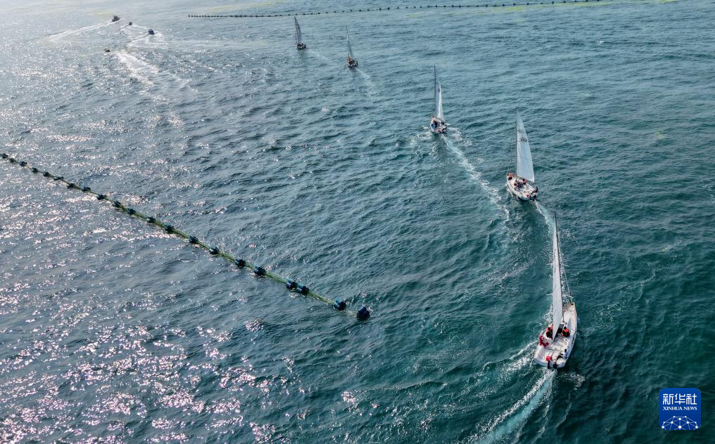青岛小麦岛附近海域,市民和游客乘坐帆船参加海上巡游活动(7月10日摄,无人机照片)。