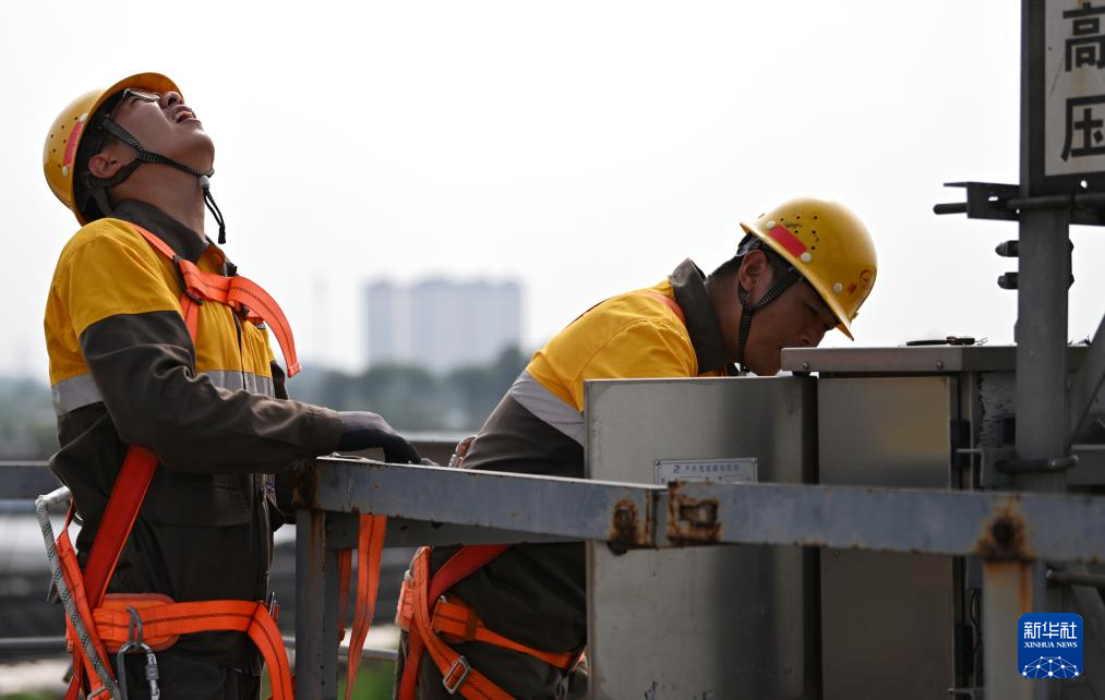 天津供电段的接触网工在高温下穿戴安全用品(7月9日摄)。