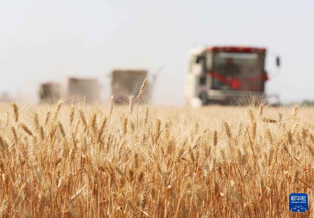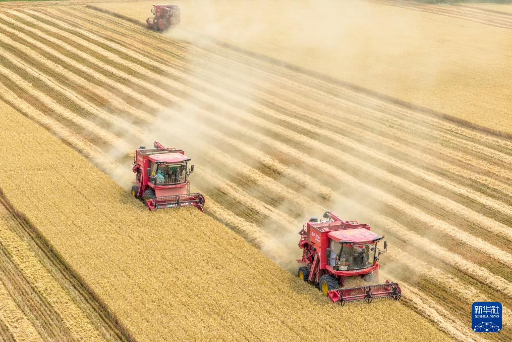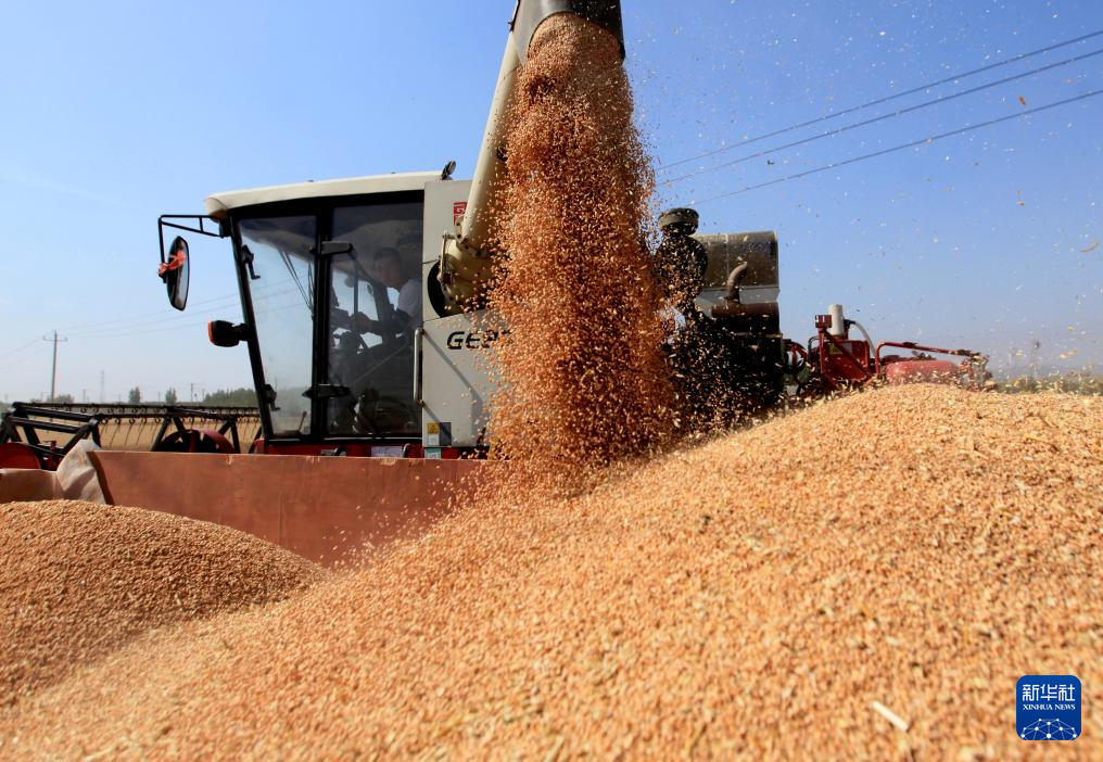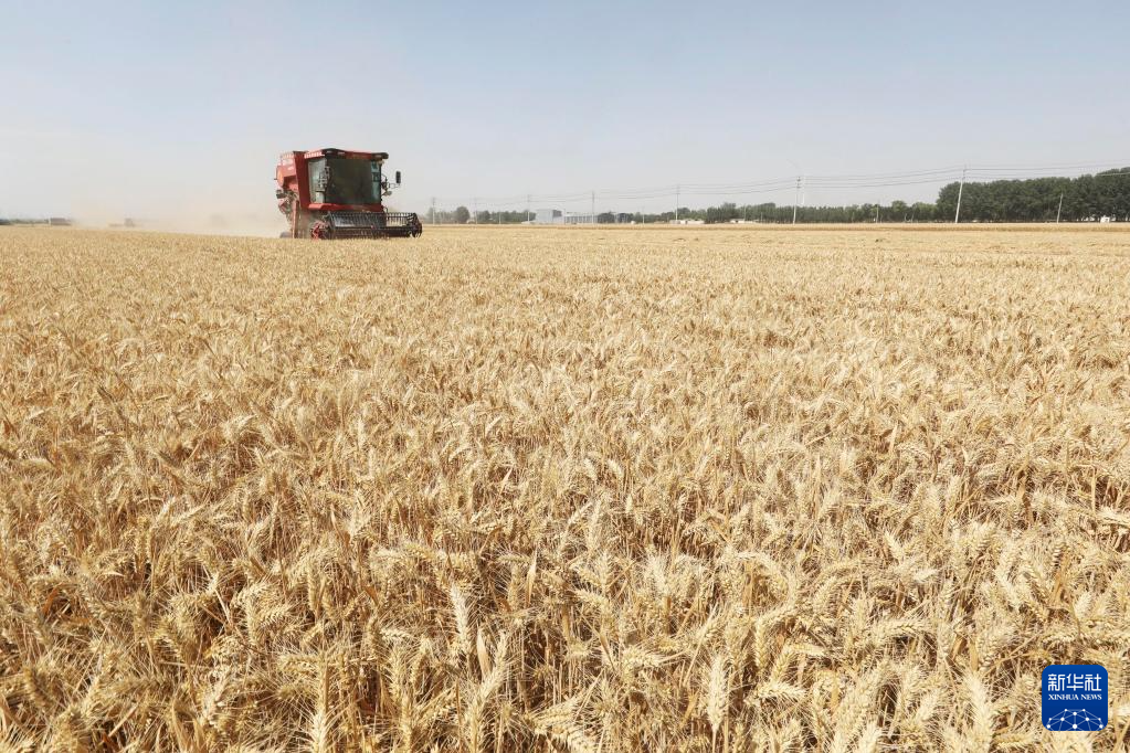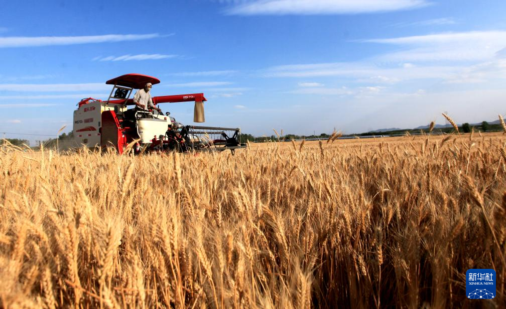 6月10日,河北省石家庄市栾城区柳林屯乡东牛村村民驾驶农机收割小麦。