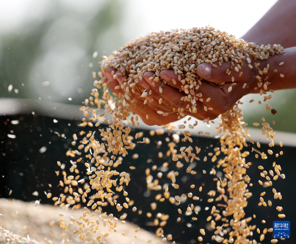5月28日,山东省临沂市郯城县郯城街道农民查看收获的小麦。