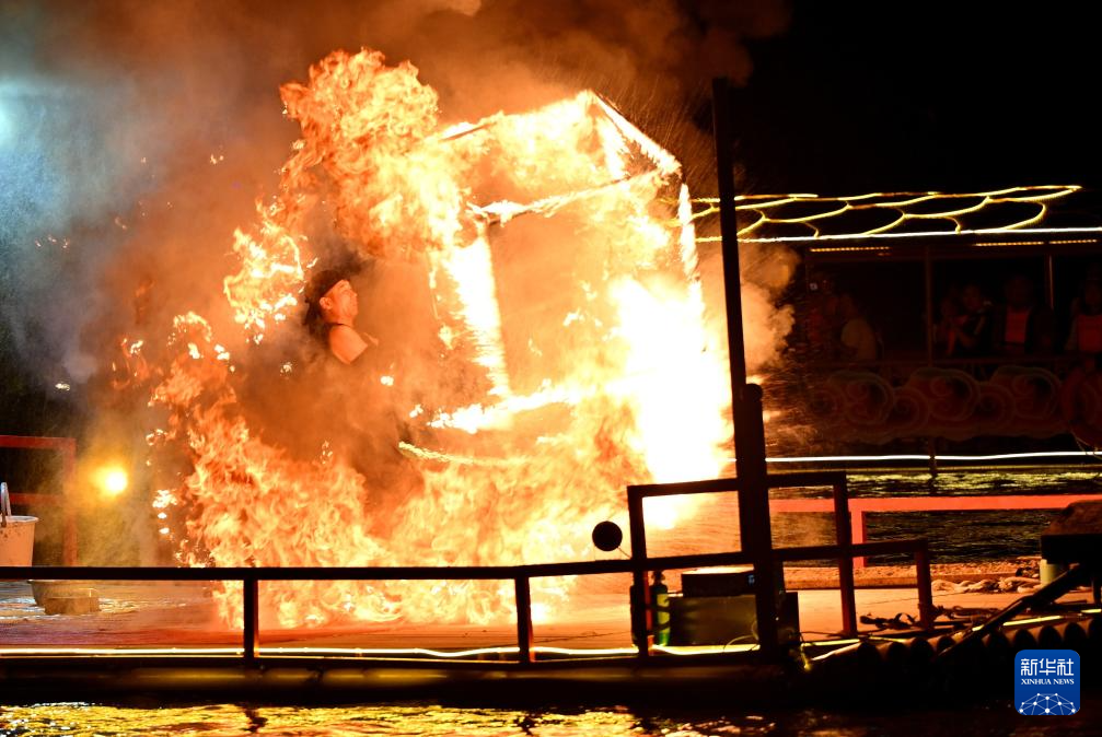 7月9日,民间艺人在湖北省宣恩县城贡水河畔为游客表演水上火壶。