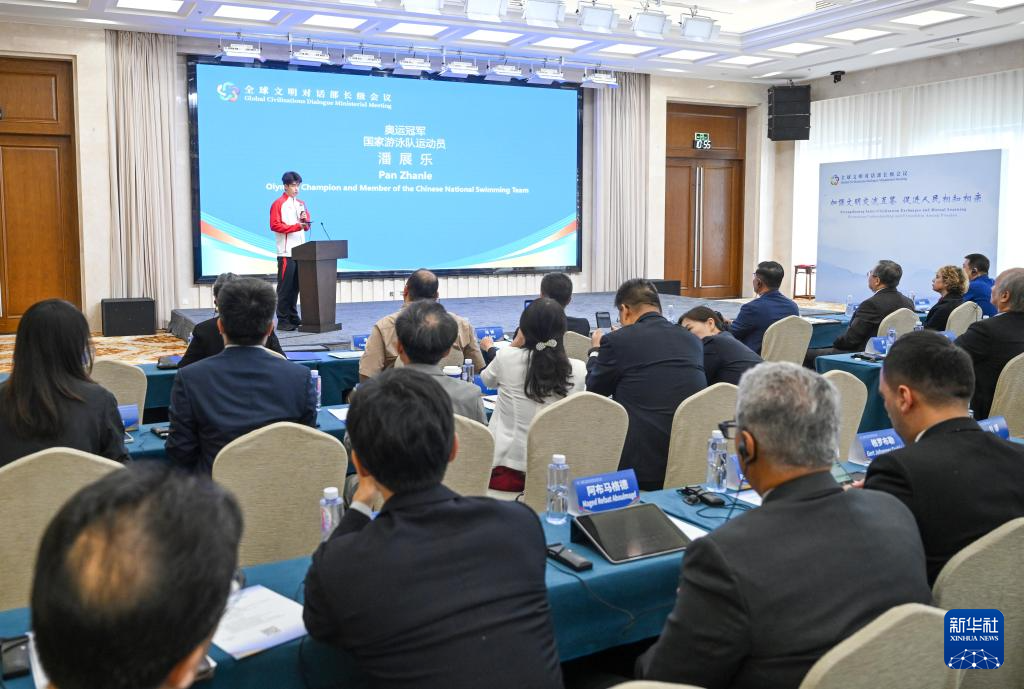 7月11日,在全球文明对话部长级会议“文明交流互鉴与人民相知相亲”平行分论坛上,奥运冠军、国家游泳队运动员潘展乐发言。