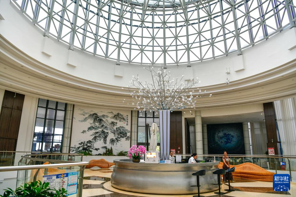 7月11日,在贵州省平塘县“天空之桥”服务区,酒店前台工作人员登记游客入住信息。