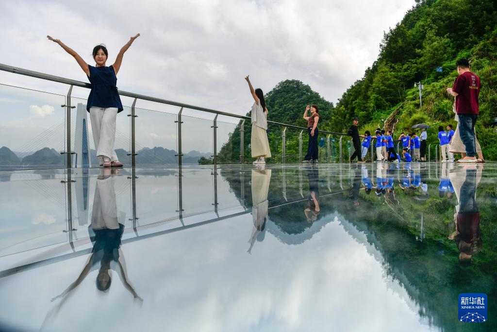 7月11日,游客在贵州省平塘县“天空之桥”服务区观景平台留影。