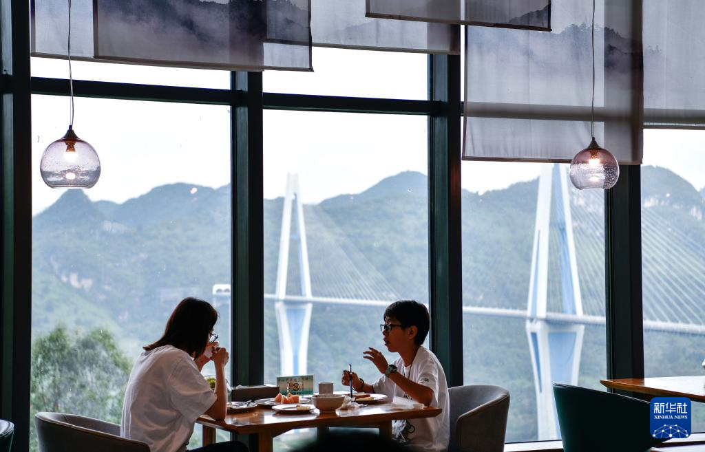 7月11日,游客在贵州省平塘县“天空之桥”服务区主题餐厅享用早餐。