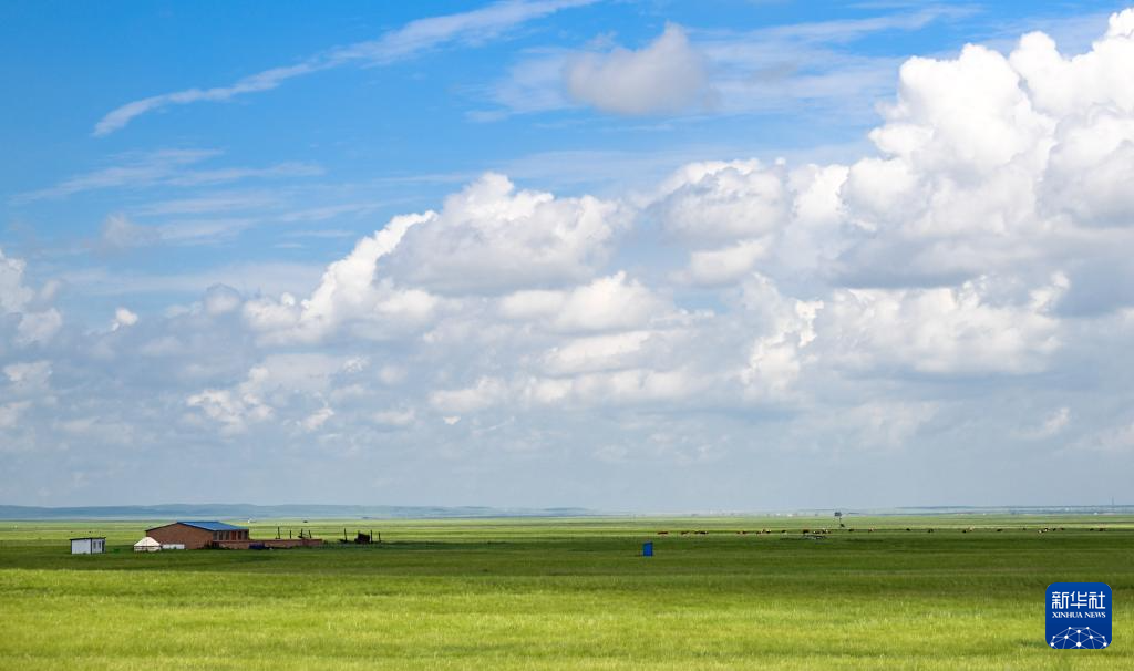 盛夏时节,内蒙古锡林郭勒盟东乌珠穆沁旗草原迎来最美季节。广袤无垠的绿茵如海般铺展,洁白的蒙古包点缀其间,成群的牛羊悠然自得。天光流转,巨大的云影在大地上缓缓移动,与起伏的草浪共同绘就一幅壮阔而宁静的游牧画卷。