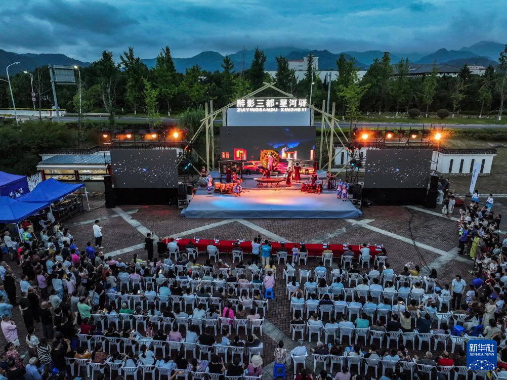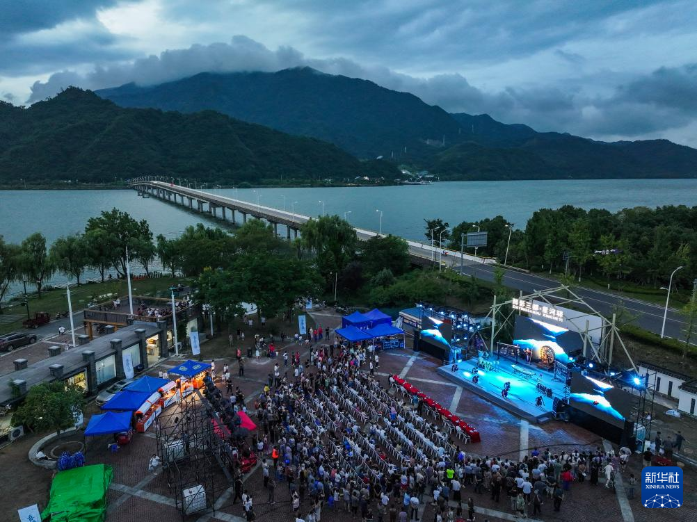 7月11日拍摄的建德市三都镇梦想大草坪的夏日音乐舞台剧表演现场(无人机照片)。