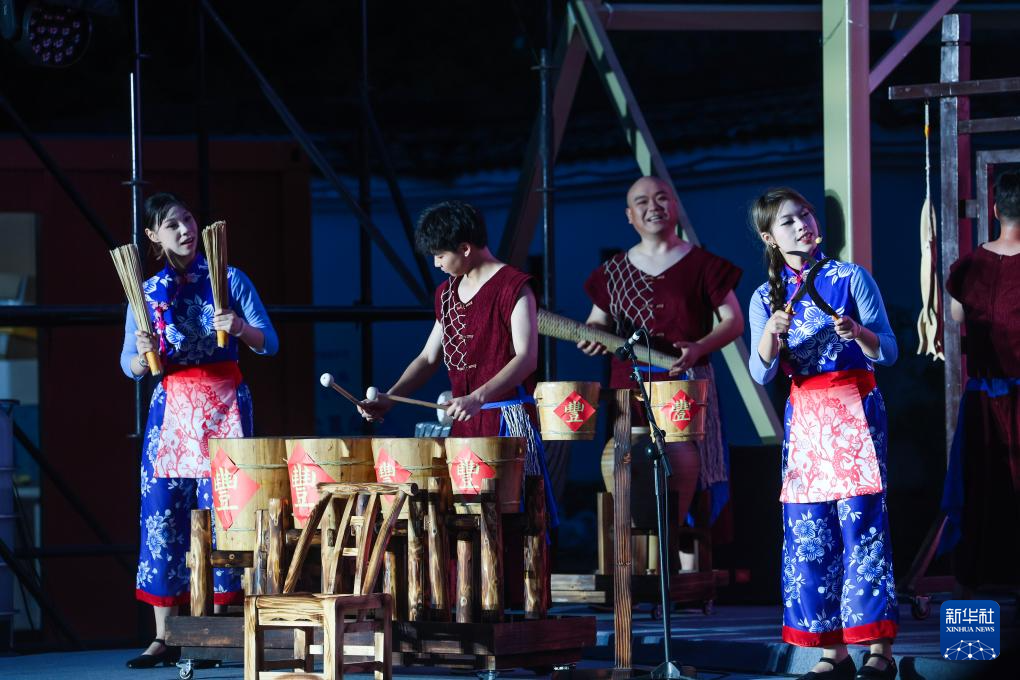 7月11日,演员用鱼篓、船桨等渔民常用的生产生活用具进行特色音乐舞台剧《渔乐糍香》演出。