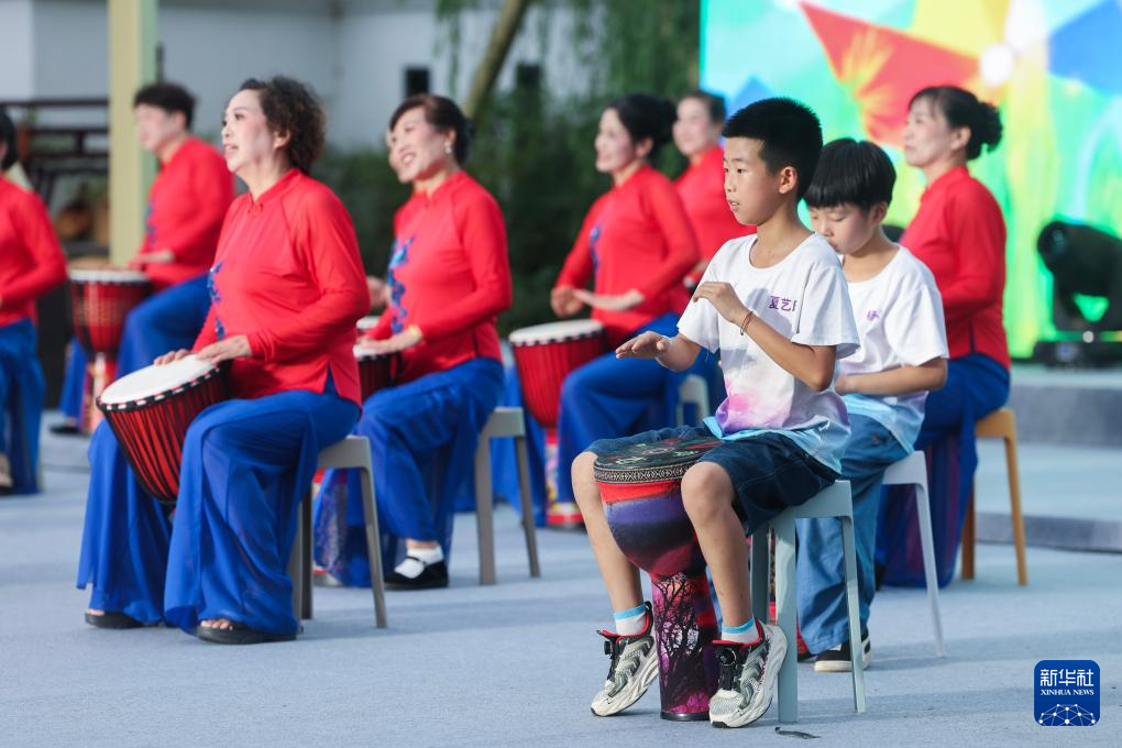 7月11日,三都镇乡村音乐学校的村民们在演奏手鼓。