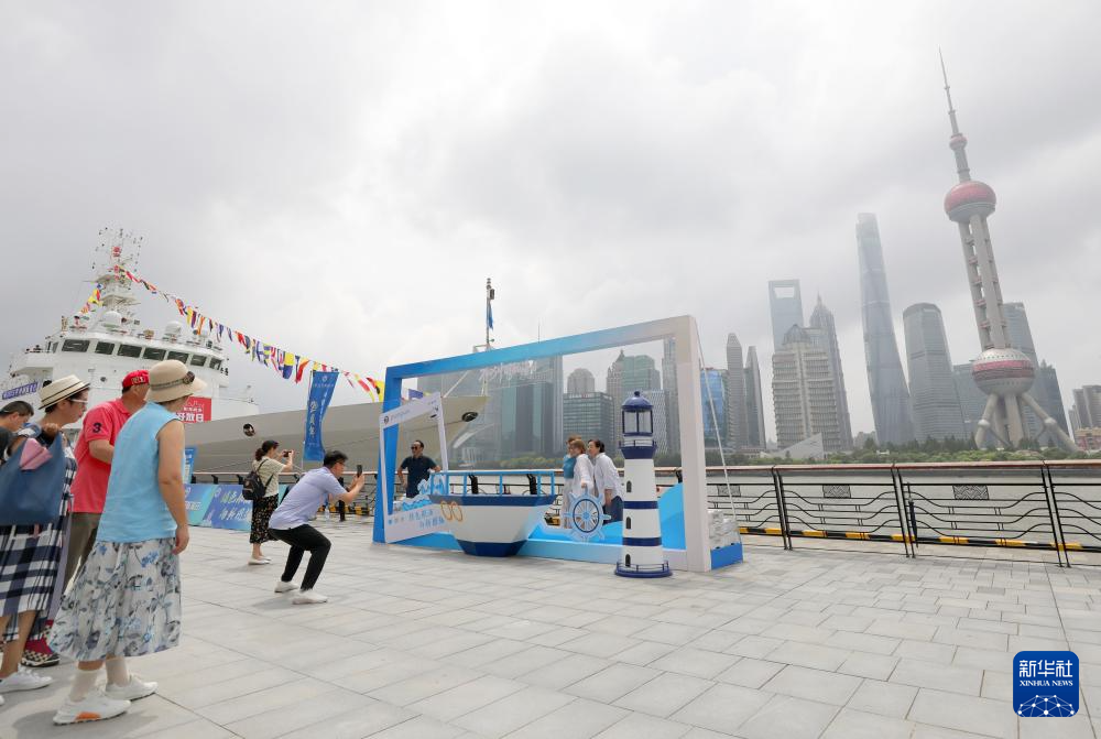 7月11日,游人在北外滩国际客运中心码头上布置的航海日主题装饰展板前拍照。