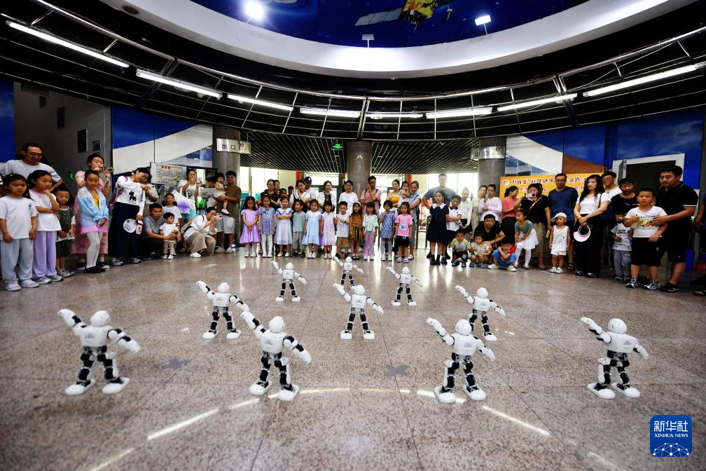 7月12日,山东省青岛市市北区海安幼儿园的小朋友们在观看舞蹈机器人表演。