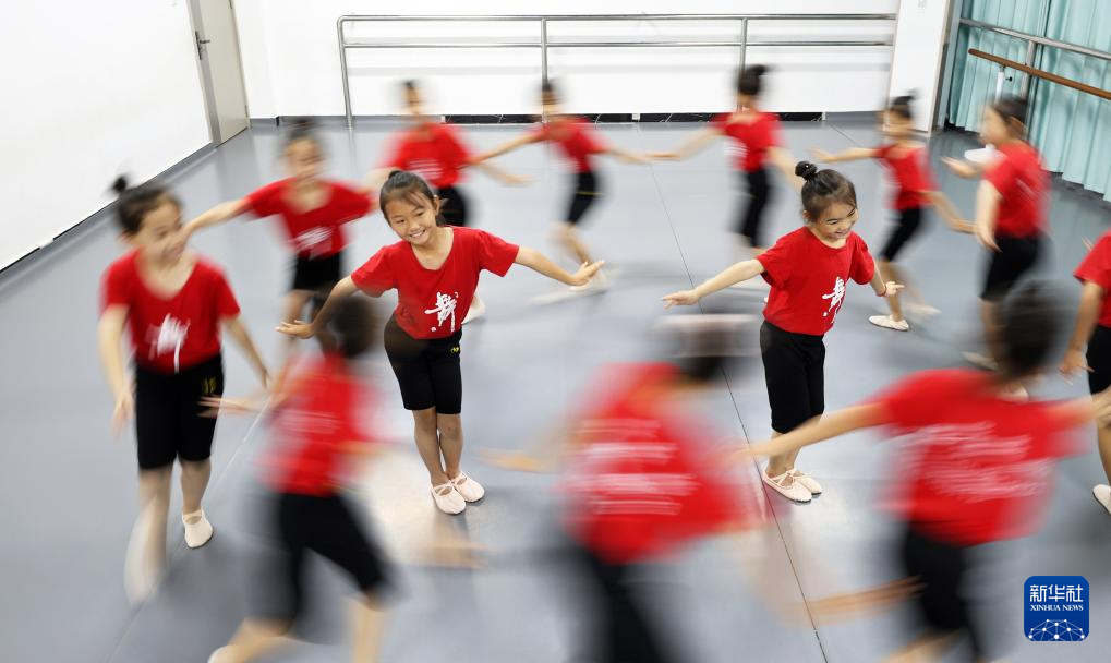 7月12日,在山东省临沂市郯城县郯城街道一家舞蹈培训机构,孩子们在舞蹈老师的带领下练习舞蹈动作。