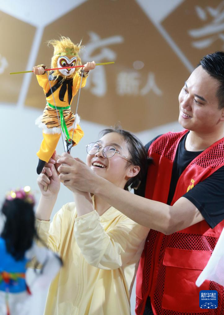 7月10日,在江苏省扬州市东昇花园社区,民间艺人指导孩子们学习扬州木偶技艺。