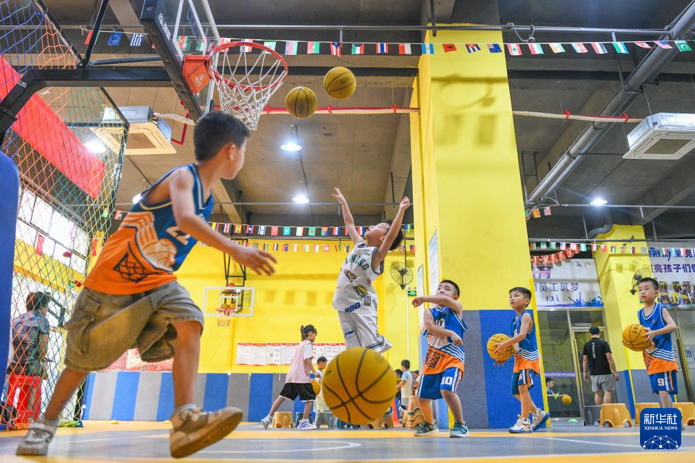 7月12日,在湖南省永州市道县濂溪街道东阳社区一体育培训机构,孩子们在参加篮球训练。