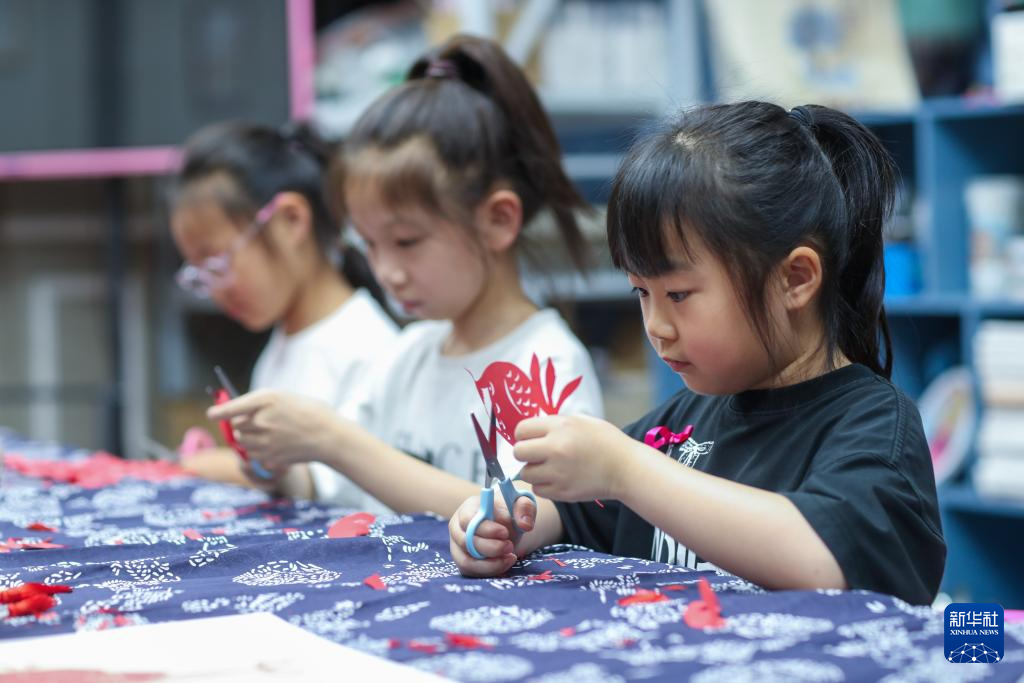 7月12日,在江苏省兴化市昭阳街道垛上农民画非遗工坊,小朋友在老师的指导下练习剪纸。