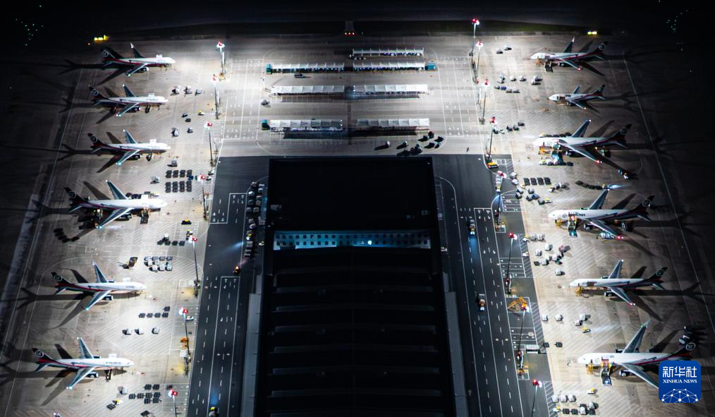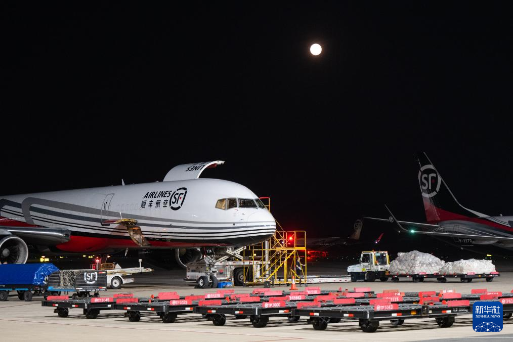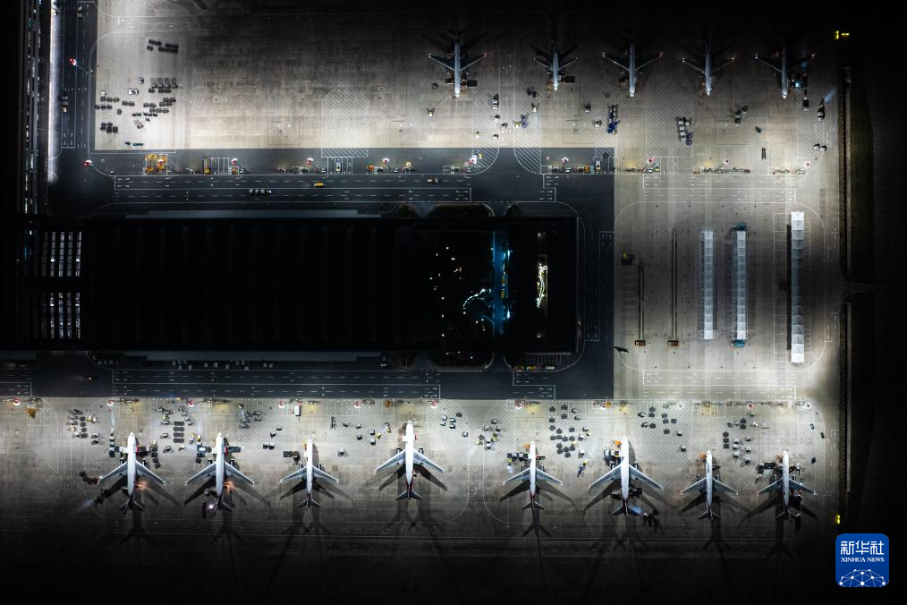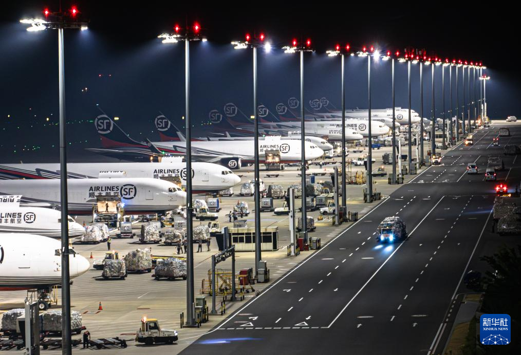 子夜时分,鄂州花湖国际机场灯火通明,几十余架货机整齐排列在停机坪上,上百名工作人员正加紧卸货。当晚,共有来自国内外的近4000吨货物在这里集结中转,再运送到全国和世界各地。