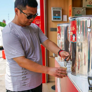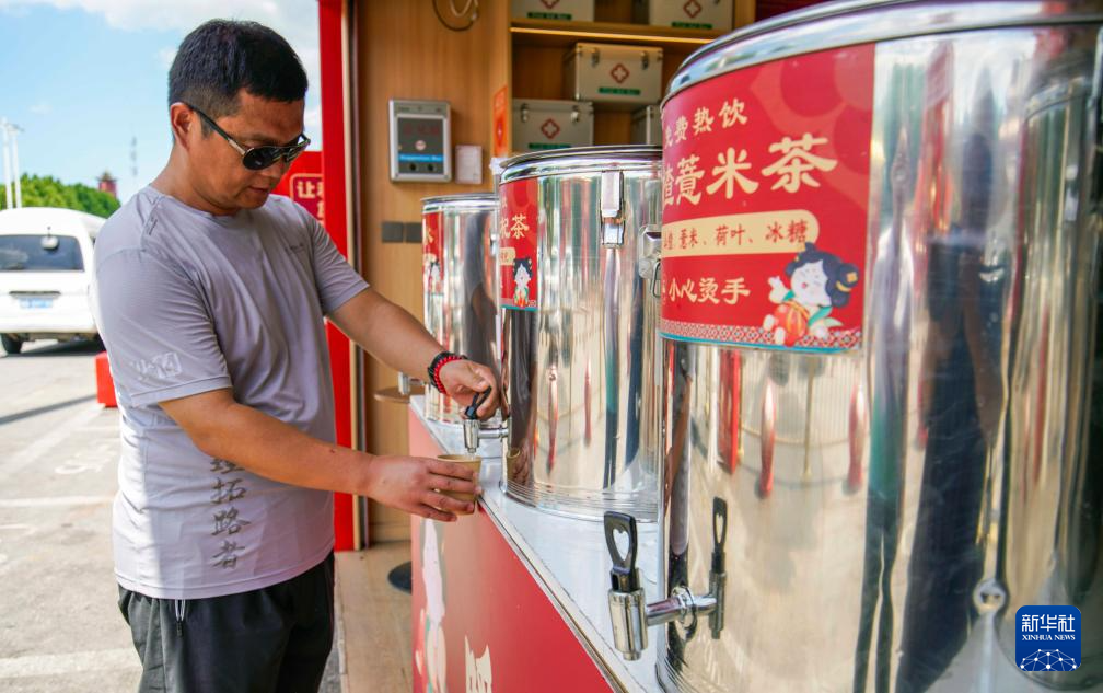 7月13日,游客在河北省丰南区河头老街景区暖心驿站享受免费饮品。