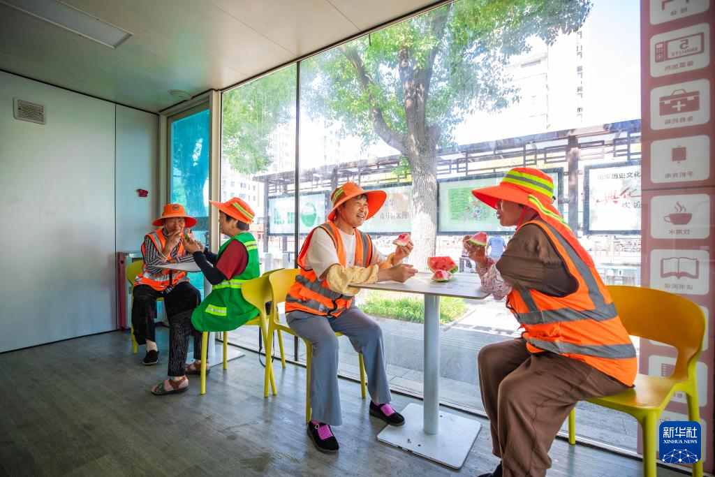 7月13日,环卫工人在江苏省兴化市昭阳街道沧浪社区的工会驿站吃西瓜消暑。
