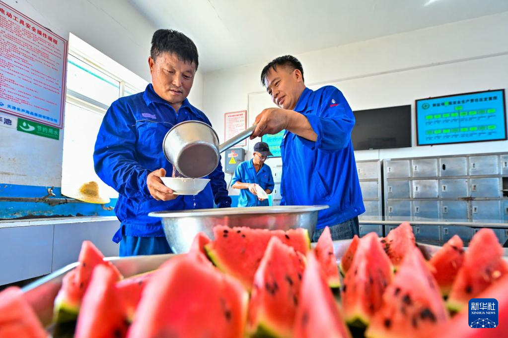 7月13日,在天津长芦海晶集团有限公司的盐田作业现场,工人领取西瓜。