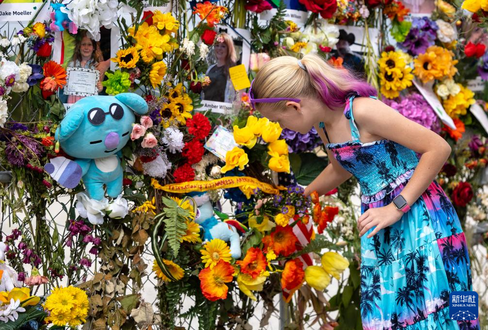 7月12日,人们在美国得克萨斯州克尔维尔献花悼念洪灾遇难者。