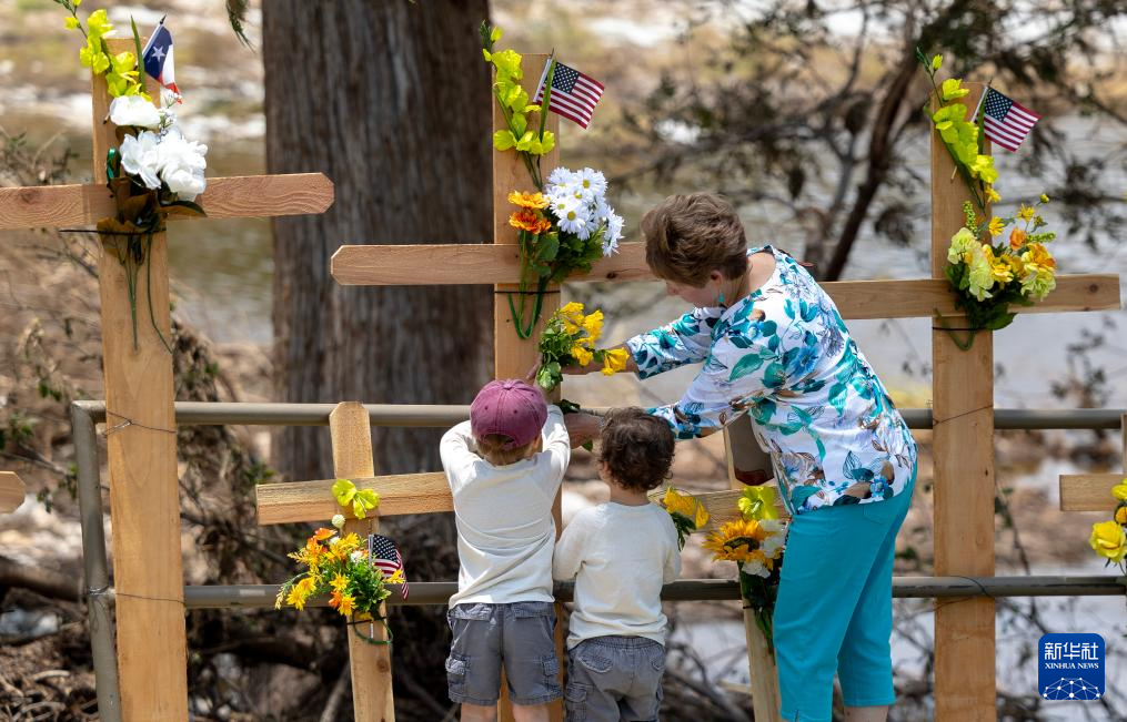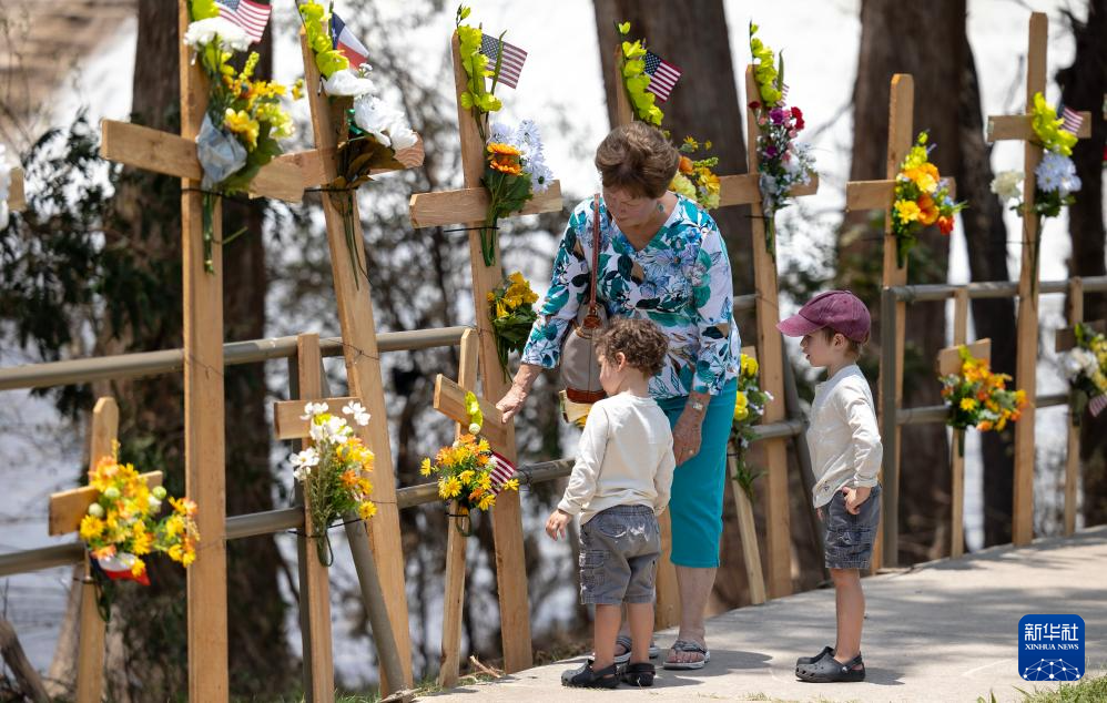 7月12日,人们在美国得克萨斯州克尔维尔一处临时纪念场所悼念洪灾遇难者。