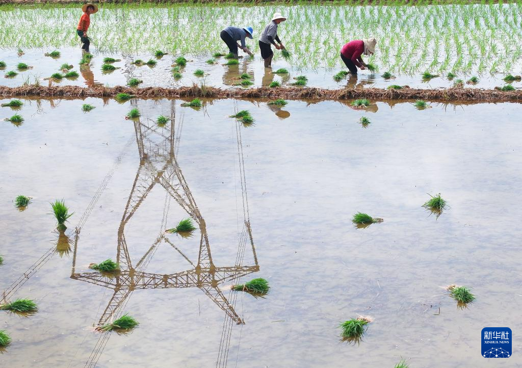 7月13日,湖南省衡阳市衡东县霞流镇农民在抢插晚稻(无人机照片)。
