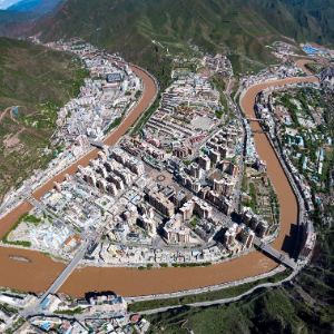 红棕色的河水波涛汹涌,砖红色的山脉连绵不绝。山水间的红土地上,房屋、桥梁、广场等带有红色装饰的建筑错落分布,将这座历史悠久的藏东山城装点成一幅立体的油画。