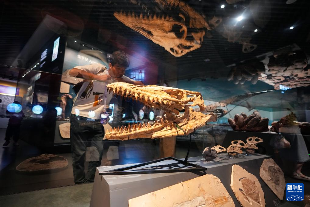7月15日,游客在澄江化石地世界自然遗产博物馆参观古生物头骨化石。