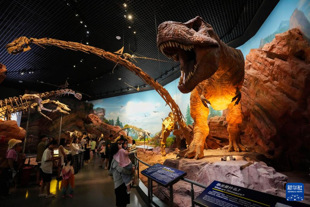 7月15日,游客在澄江化石地世界自然遗产博物馆参观恐龙模型及化石。