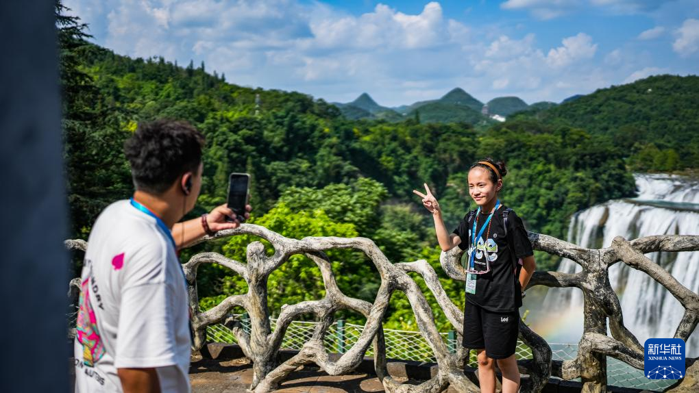 7月16日,游客在贵州省安顺市黄果树瀑布景区留影。
