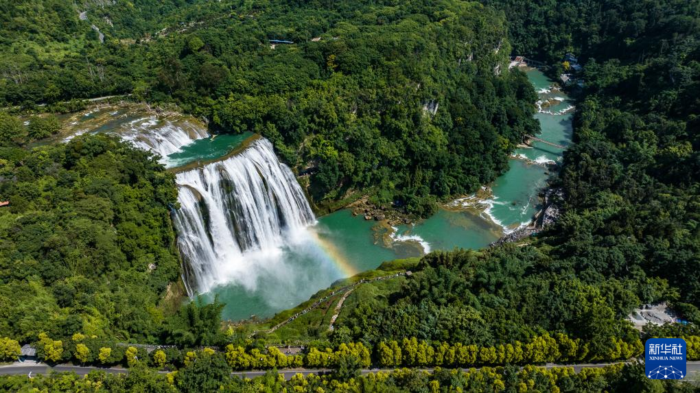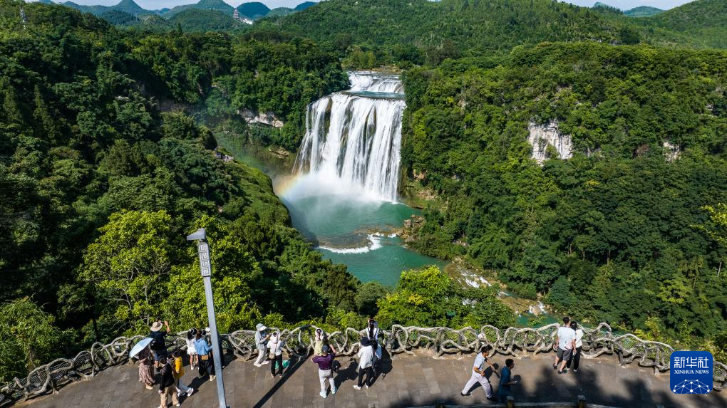近日,位于贵州省安顺市的黄果树瀑布景区正处于夏日最佳观赏期。黄果树大瀑布水势磅礴,在阳光的照射下,瀑布前架起一道彩虹,美丽的景象吸引各地游客前来观赏游玩。