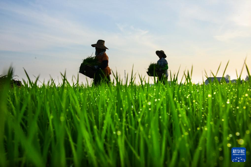 7月15日,在湖南省常德市澧县城头山镇车溪河社区,村民在晚稻秧田转运秧苗。