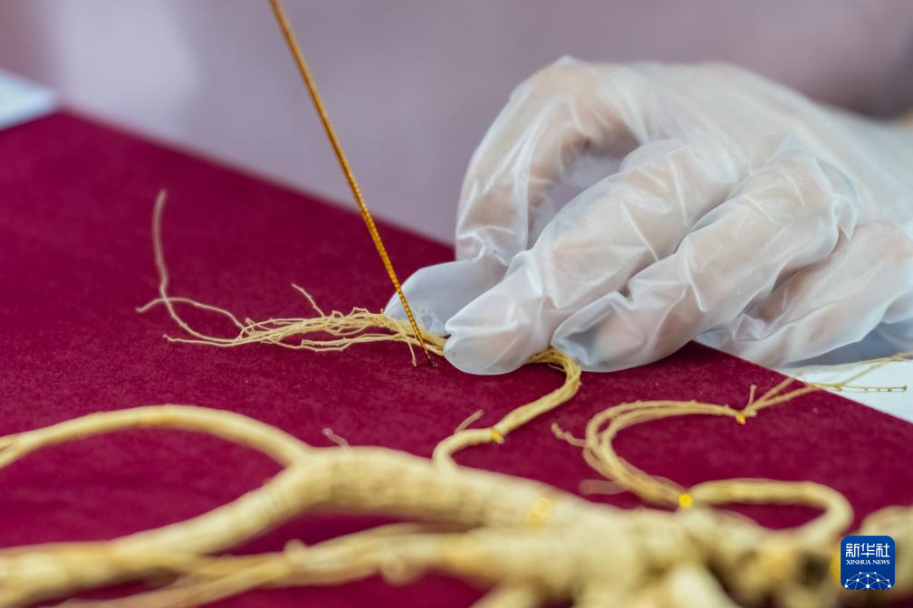 7月15日,吉林省永吉县博大农科公司人参加工厂,工人在手工捆扎人参,准备制作礼盒产品。