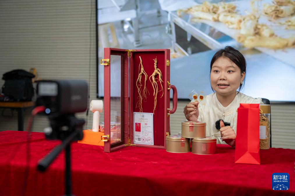 7月15日,吉林省永吉县博大农科人参产品电商营销中心,电商主播在直播售卖当地特色人参产品。