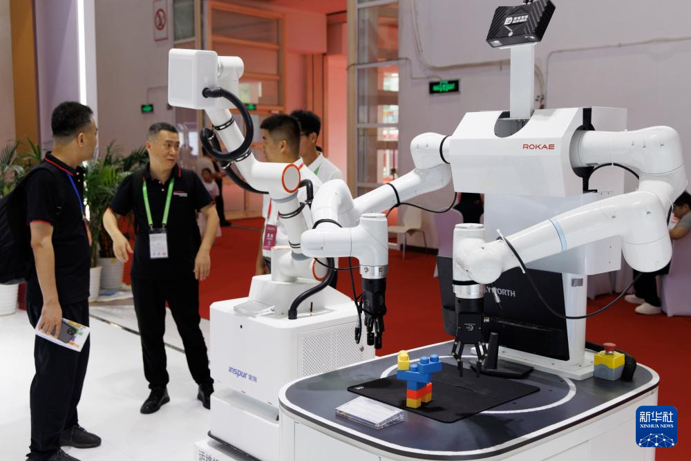 7月16日在第三届中国国际供应链促进博览会主宾省山东省展台拍摄的具身智能双臂机器人。