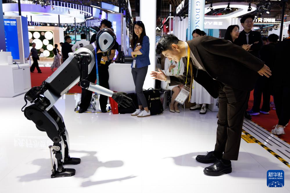 7月17日,在第三届中国国际供应链促进博览会主宾省广东省展台,商用版人形机器人“行者”和一位媒体记者互致问候。