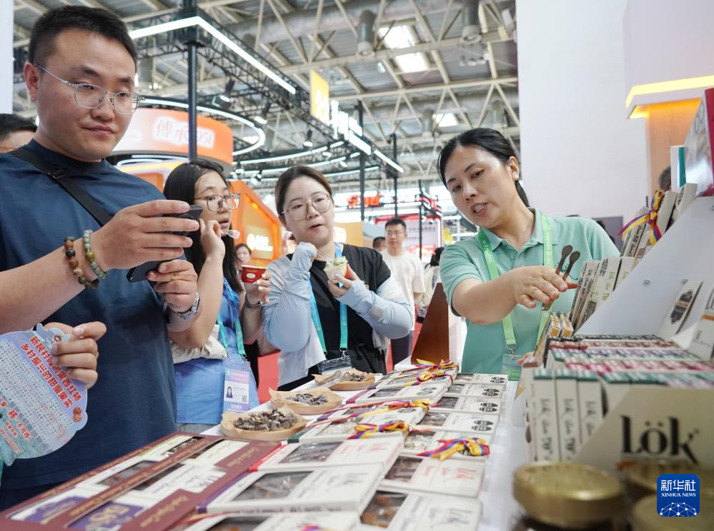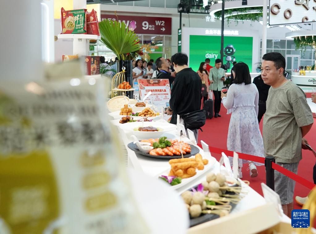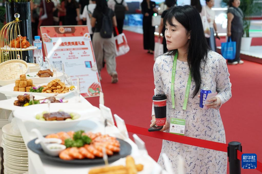7月18日,参会者在绿色农业链展区参观展出的美食。
