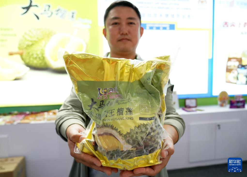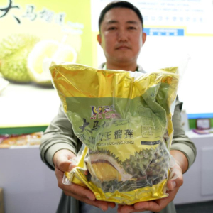7月18日,工作人员展示一款来自马来西亚的冷冻猫山王榴莲产品。