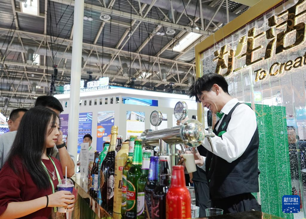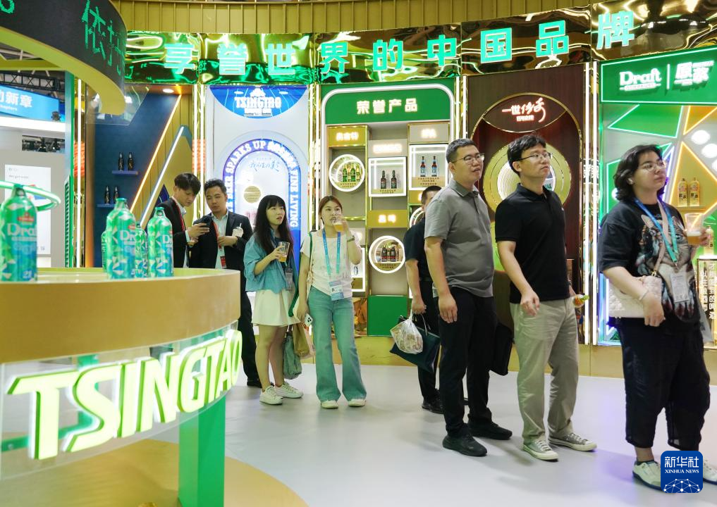 7月18日,参会者在绿色农业链展区品尝啤酒。