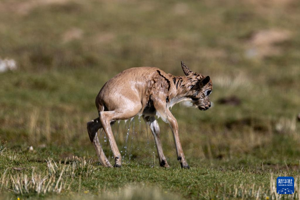 一群带着幼崽的藏羚羊成功渡过森隆藏布河,幼崽身上水迹未干(7月15日摄)。