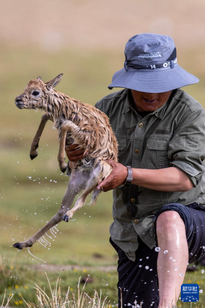 管护队员次旺在救助一只被激流冲走的藏羚羊幼崽(7月14日摄)。