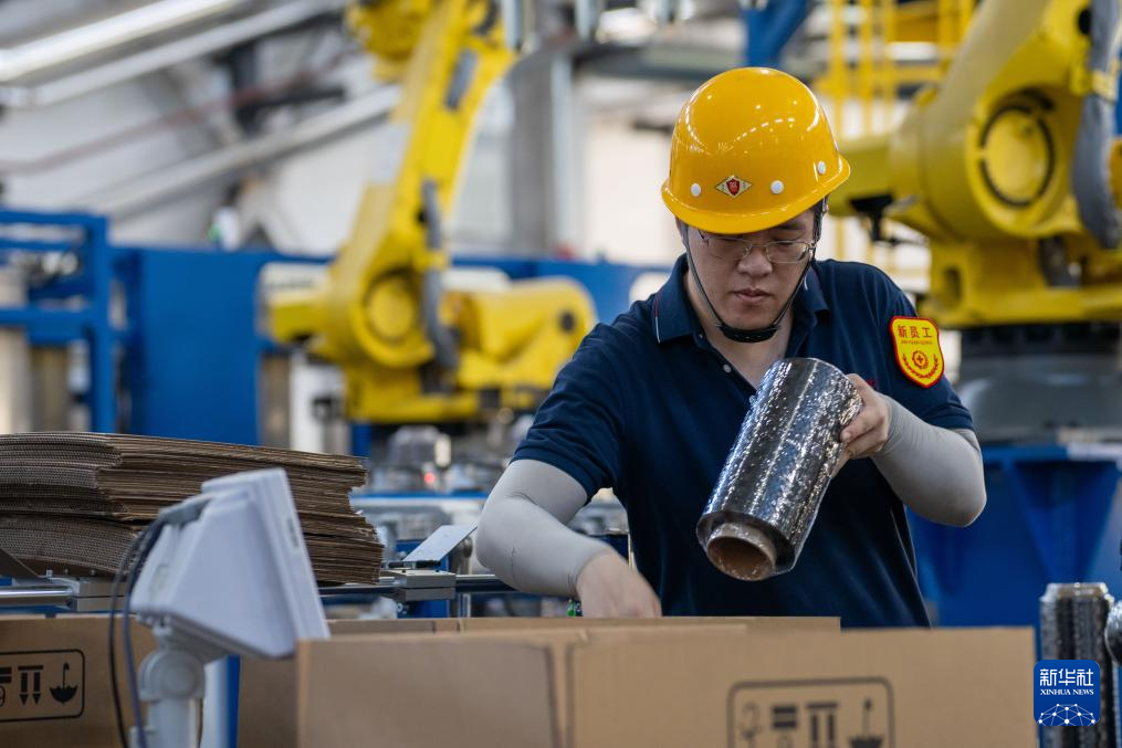 7月16日,在吉林化纤集团碳纤维生产车间,工人将生产好的碳纤维丝卷筒装箱。