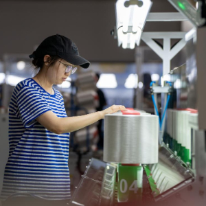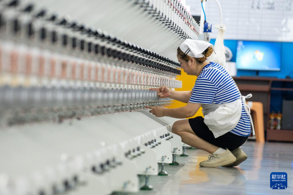 7月16日,在吉林化纤集团纺丝生产车间,工人检查纺丝原料。