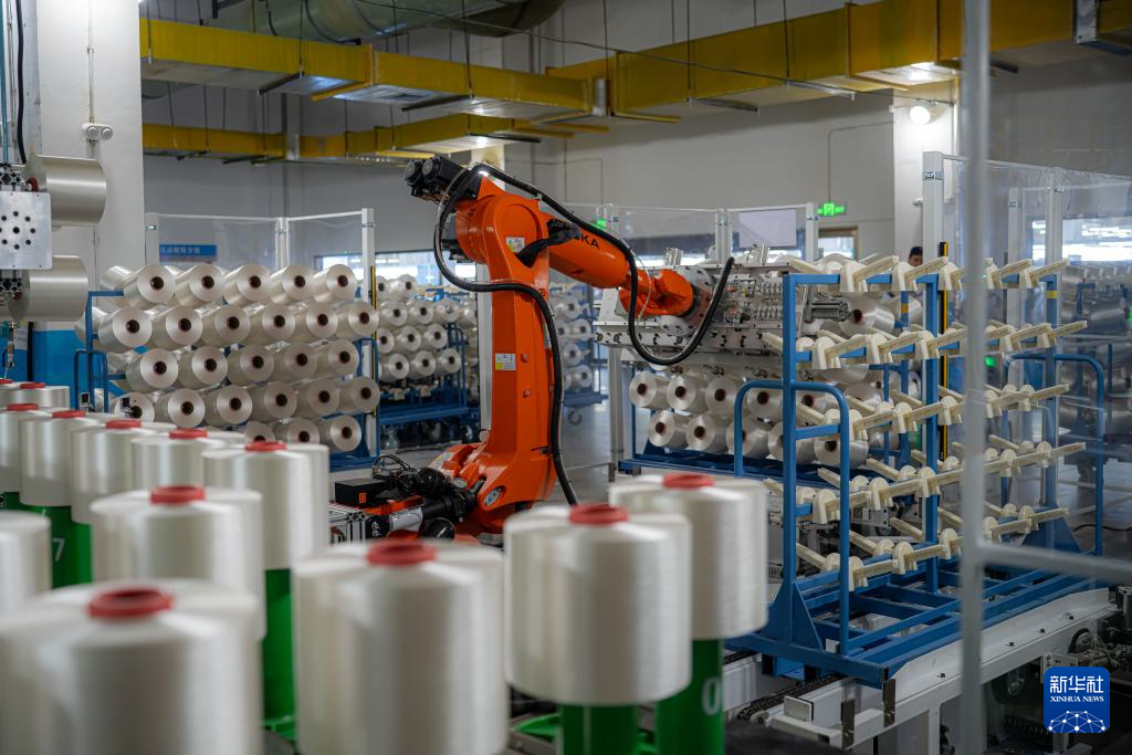 7月16日,在吉林化纤集团人造丝生产车间,机械臂码放成品丝筒。