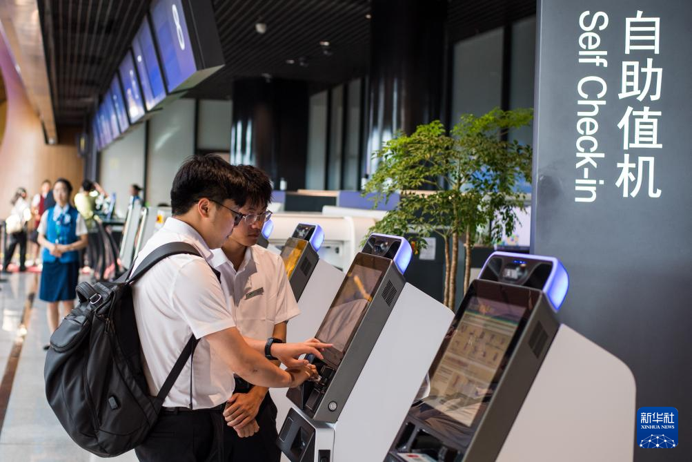 7月18日,旅客(左)在丽水机场办理值机手续。