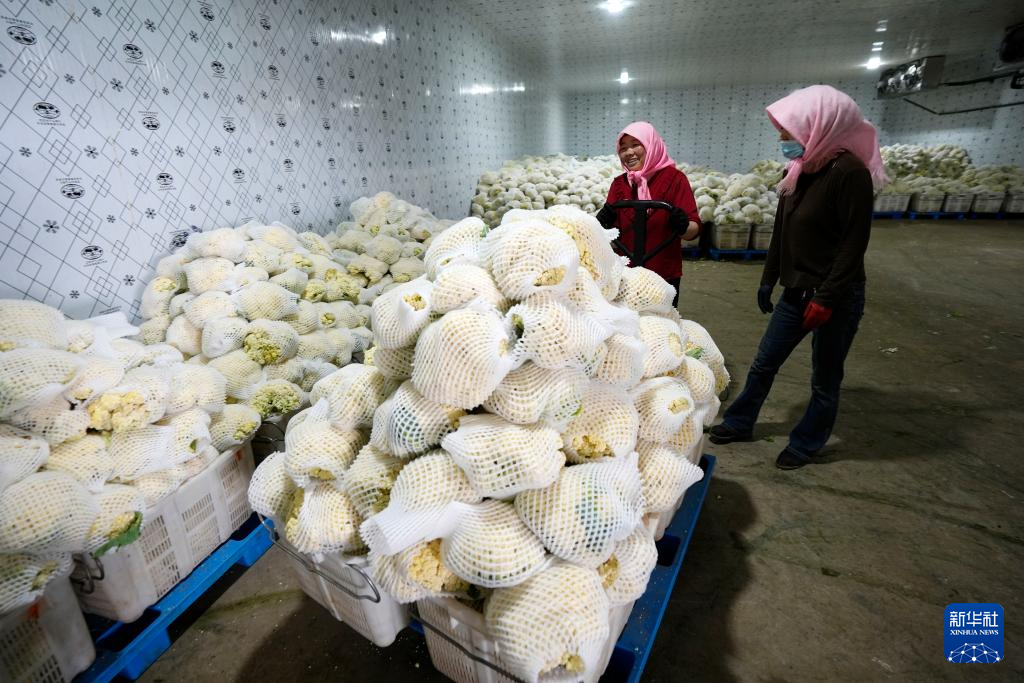 7月18日,工作人员在固原市原州区彭堡镇的四合农业合作社冷库搬运菜花。