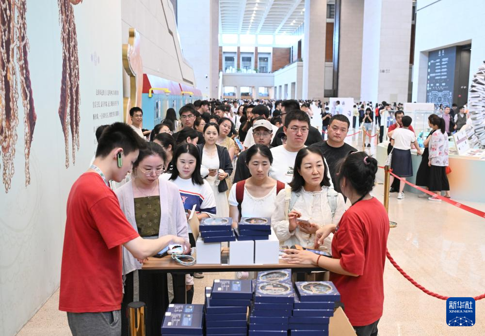 7月19日,观众在北京中国国家博物馆排队购买凤冠冰箱贴。