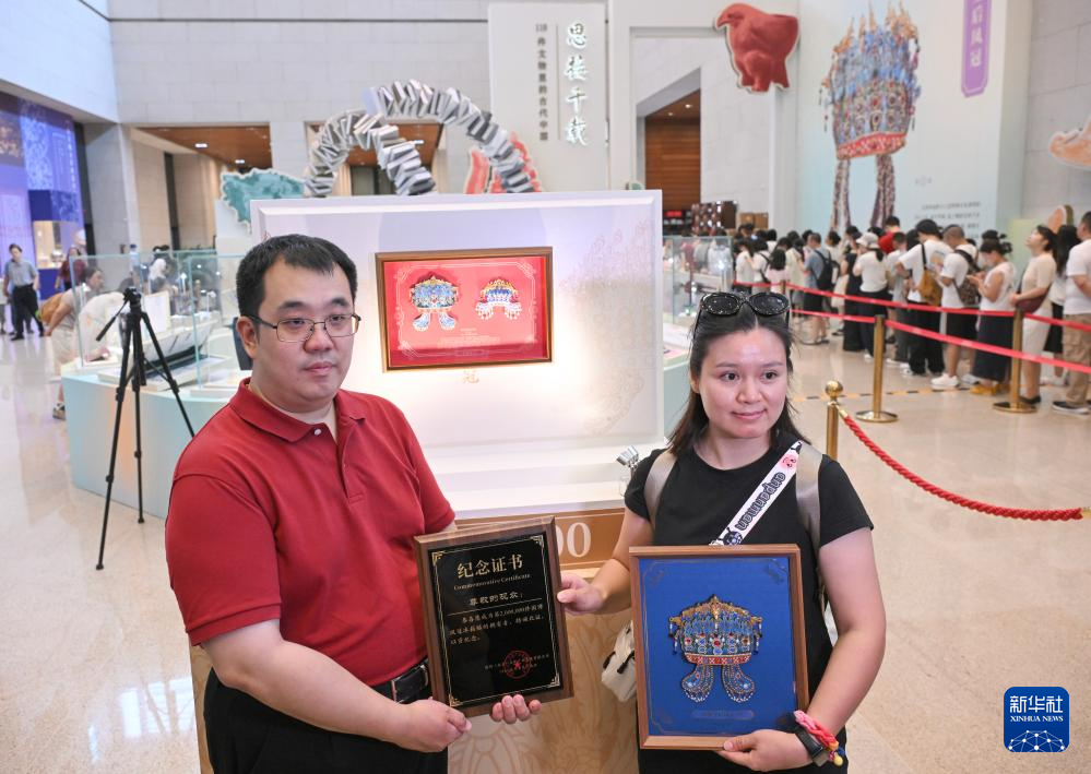 7月19日,国博文创负责人廖飞(左)向第200万件凤冠冰箱贴的购买者颁发纪念证书。